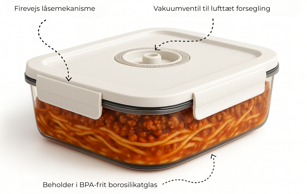 Indbygget pakning og vakuumventil sikrer tæt og sikker opbevaring – uden spild.