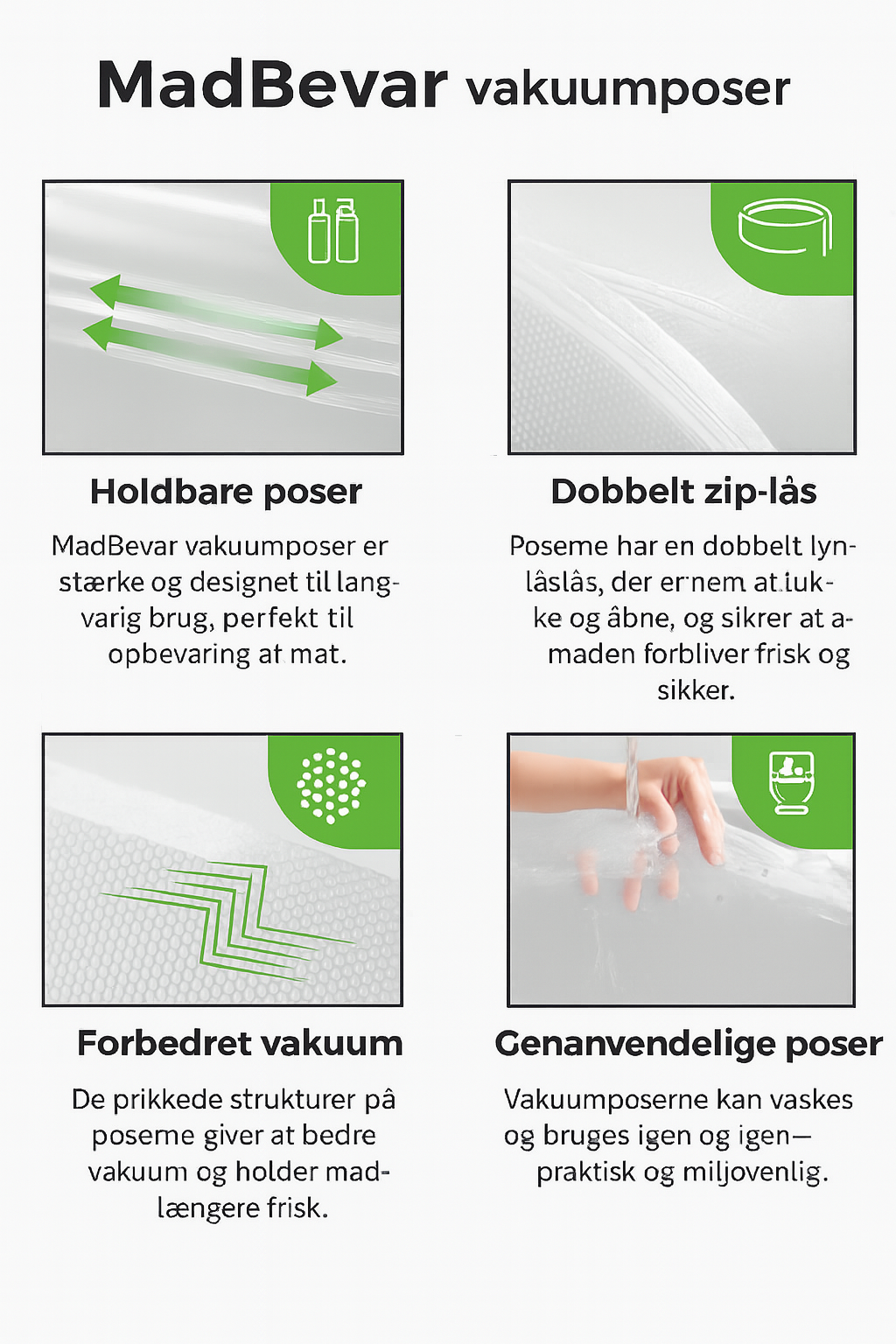 Med vores vakuumposer holder maden sig frisk meget længere, så du undgår madspild.