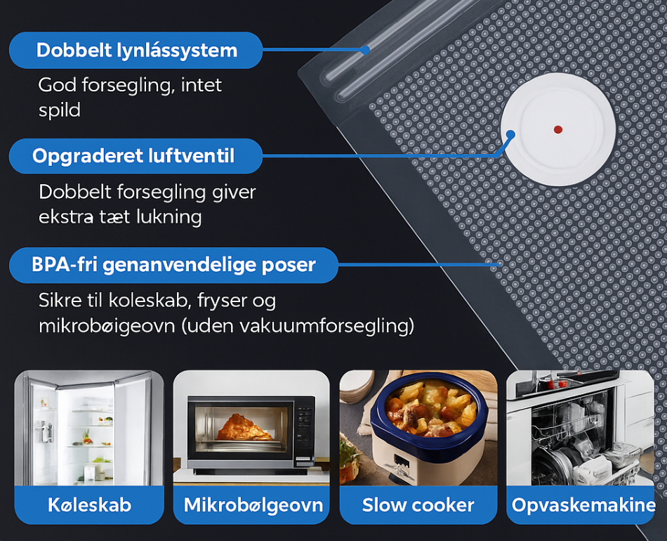 Maskinen suger automatisk al luften ud og forsegler posen tæt. Maden holder sig frisk meget længere og kan opbevares sikkert i fryser eller køleskab.